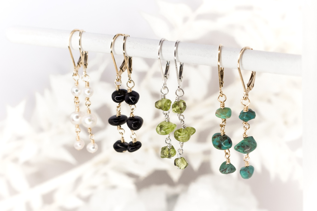 These X crystal beaded chain dangle leverback earrings dangle delightfully and feature three genuine gemstone beads on each earring.