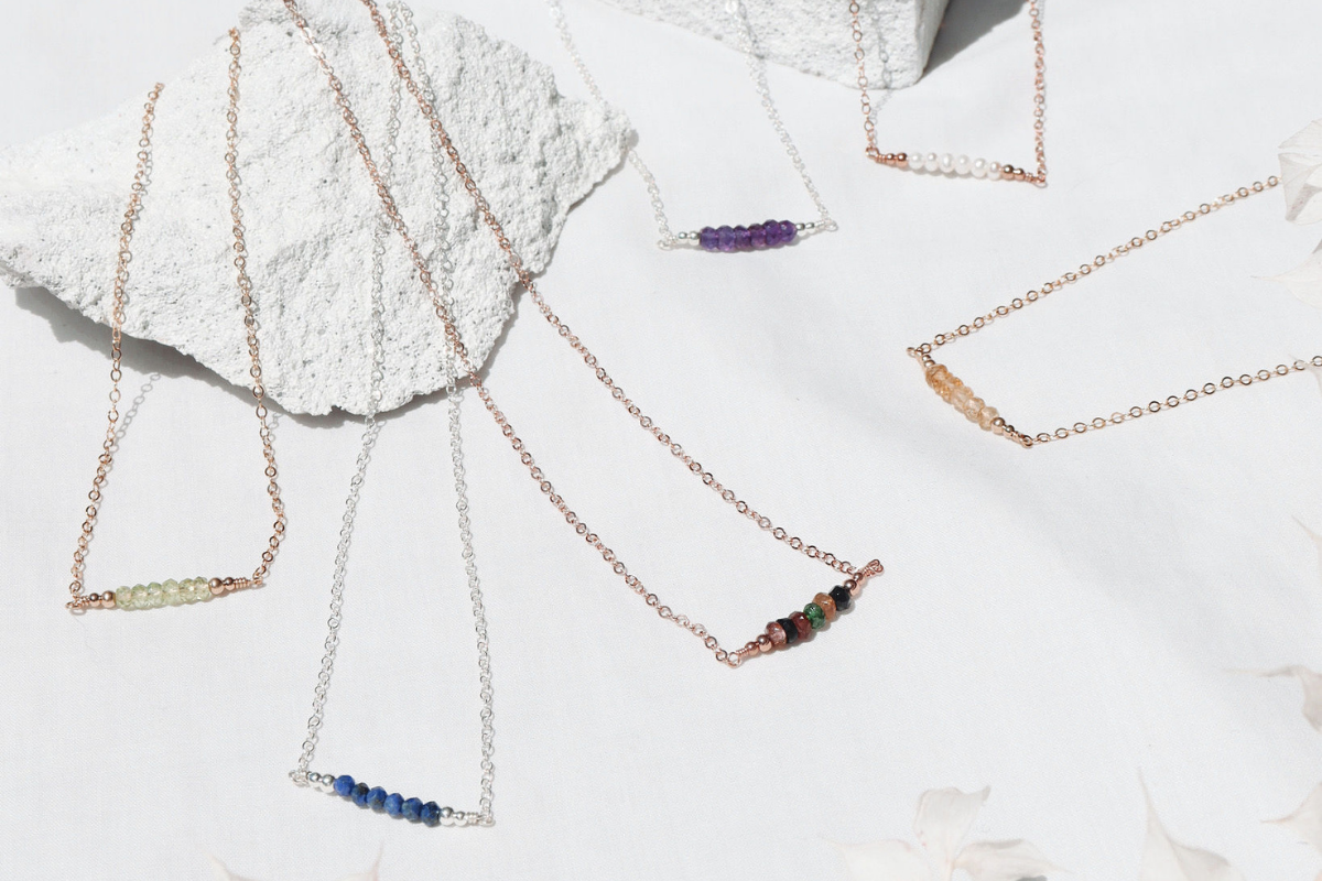 Make every day special in our tanzanite tiny bead bar necklace. This necklace is a dainty, feminine design that looks lovely worn either alone or layered with other dainty necklaces. The semi-precious gemstone beads used in this necklace are made from natural, genuine gemstones that have been faceted cut so they sparkle in the light, making it the ideal necklace for evening wear, weddings and special occasions.