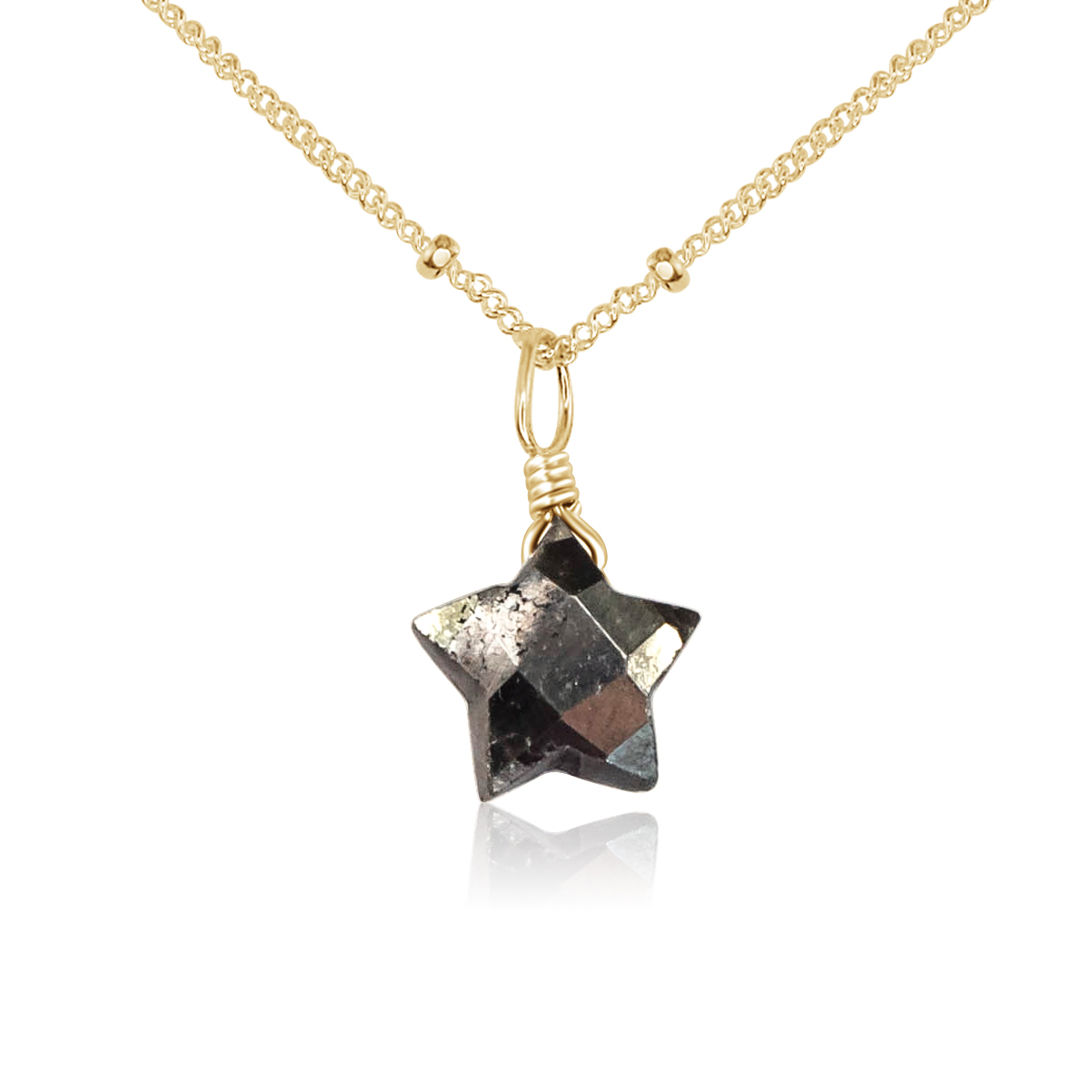 The Little Pyrite Crystal Star Pendant Necklace glows with a golden metallic shimmer, capturing the warmth and strength of sunlight held in stone. Pyrite is known as the stone of confidence and abundance, empowering you to shine with self-assurance while staying grounded and protected. The star shape radiates light and inspiration, symbolising courage, hope, and the power to manifest your dreams.