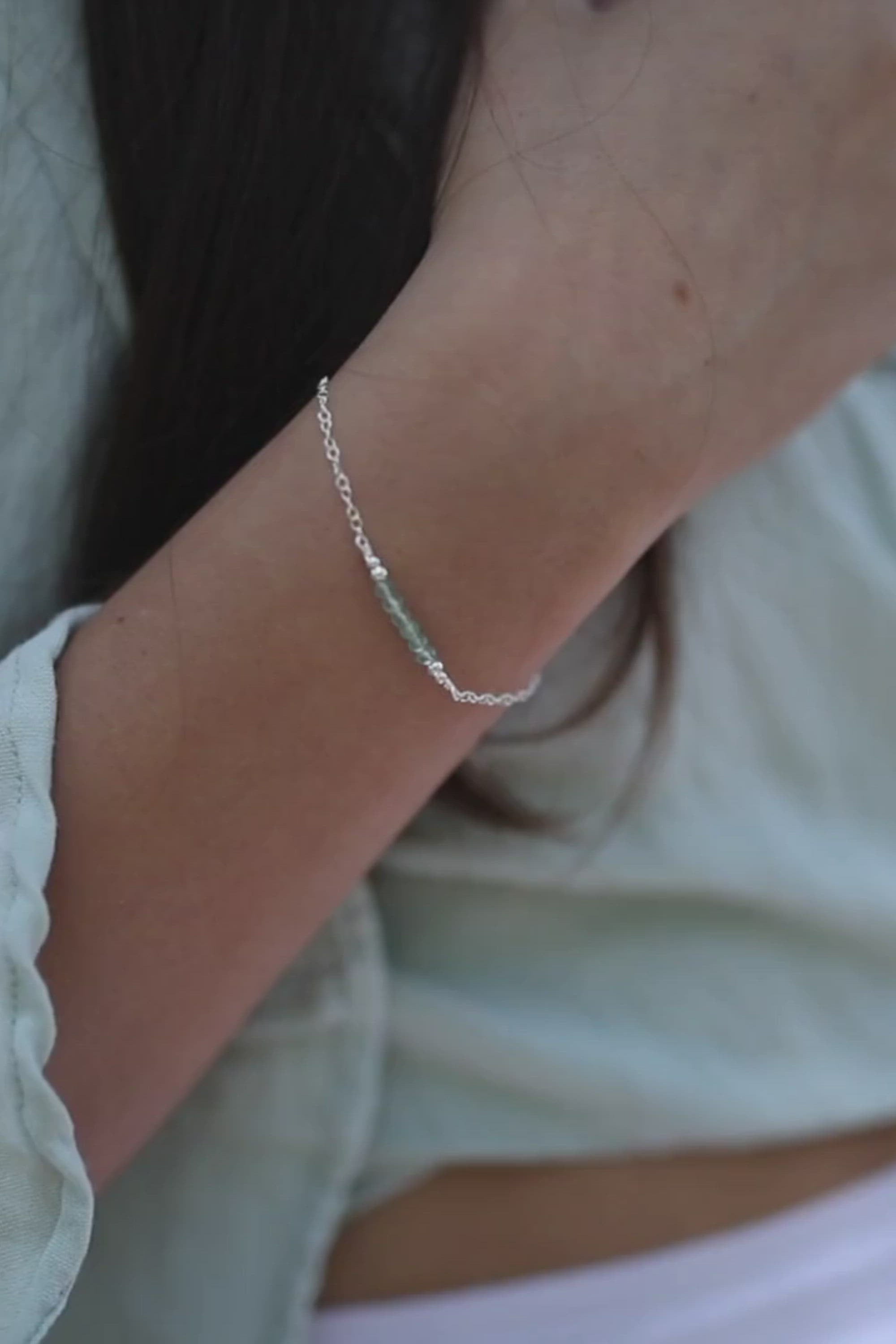 Make every day special in our tiny green aventurine gemstone bead bar bracelet. This bracelet is a dainty, feminine design. The semi-precious gemstone beads used in this bracelet are made from natural, genuine gemstones that have been faceted cut so they sparkle in the light, making it the ideal bracelet for evening wear, weddings and special occasions.